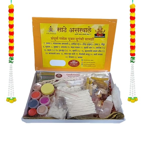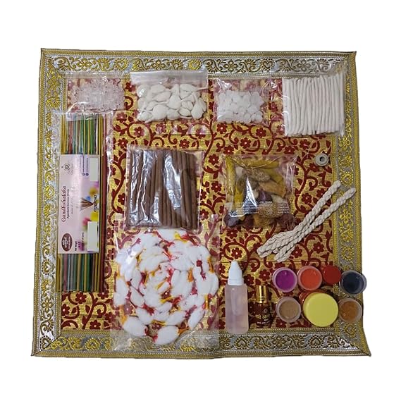 This is ganapati set contains 22 items in one complete set, it contains Aasan,Agarbatti,dhup,kharik(5),halkund(5),supari(5),badam(5),sugandhi jal,dhup stand,telwat,cotton wastra,janwe,khadi sakar,haldi,kumkum,gulal,bukka,chandan powder,ashtagandh.